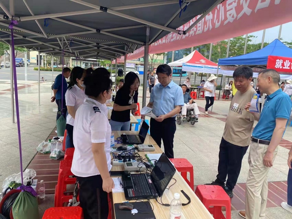 圖為工作人員現(xiàn)場(chǎng)發(fā)放服務(wù)指南,為殘疾人士詳細(xì)講解愛心卡的辦理流程和注意事項(xiàng),并聽取他們的意見和建議。