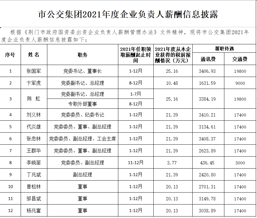 市公交集團2021年度企業(yè)負責(zé)人薪酬信息披露