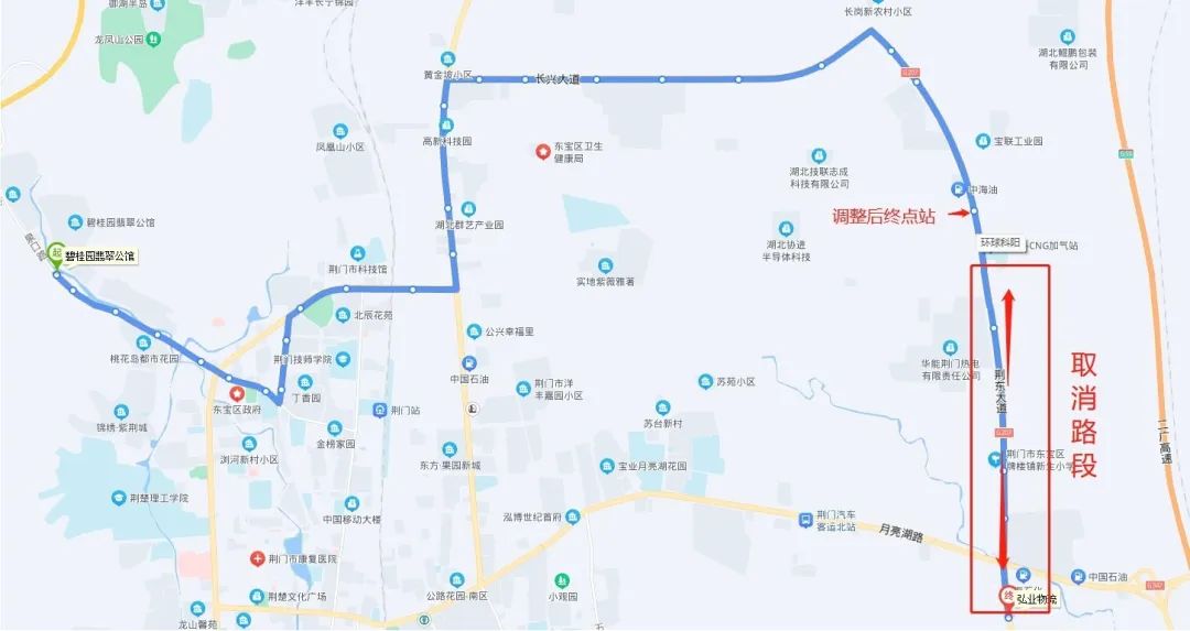具體為:碧桂園翡翠公館—宏業(yè)物流調(diào)整為碧桂園翡翠公館—環(huán)球科陽(荊東大道),暫時取消荊東大道與長崗一路交匯處—宏業(yè)物流區(qū)間路段(具體走向圖見附件)。道路施工結(jié)束后即恢復(fù)原線路運行。